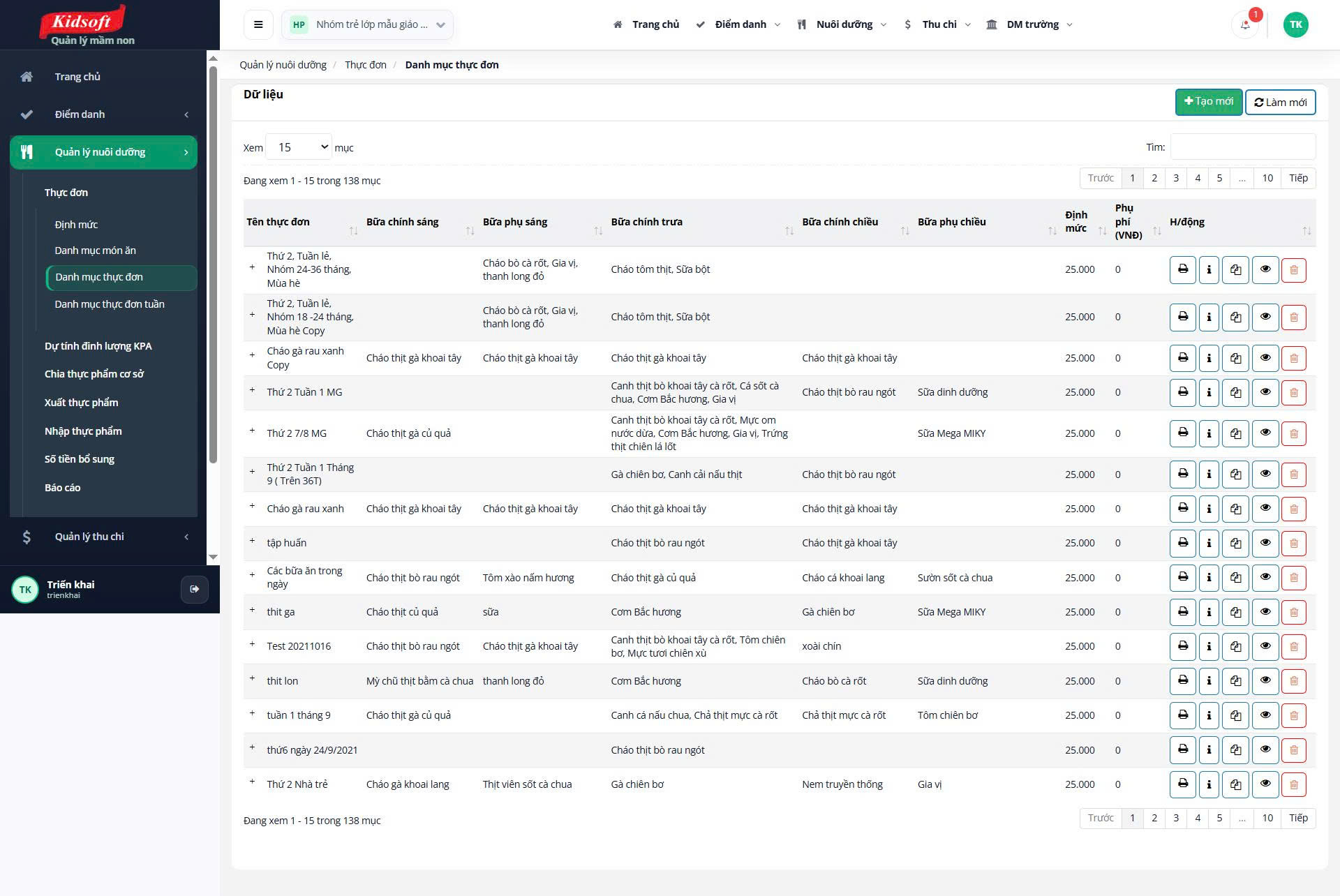 - Lập thực đơn theo ngày / tuần / tháng
